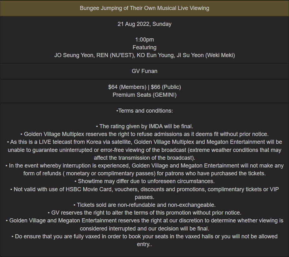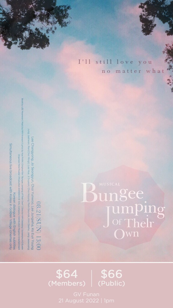 Starring JO Seung Yeon, REN (NU’EST), KO Eun Young, JI Su Yeon (Weki Meki), this musical is not to be missed. Singapore fans can catch ‘Bungee Jumping of Their Own’ at Golden Village Funan on 21st August 2022, at 1pm.