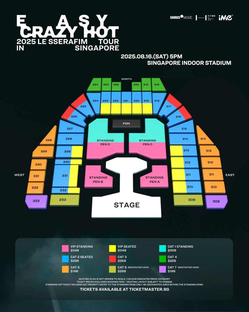 Ticket Prices: S$348 (VIP) / S$308 (CAT 1) / S$298 (CAT 2) / S$268 (CAT 3 & 6) / S$228 (CAT 4) / S$198 (CAT 5 & 7) (excluding booking fees)